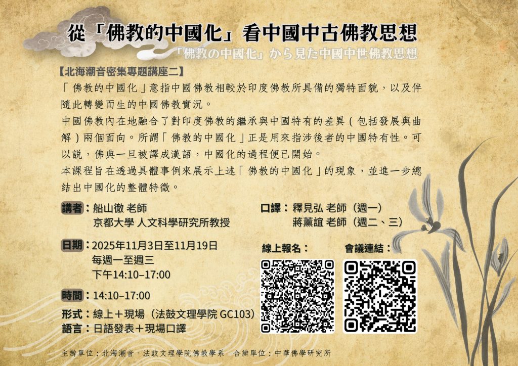 - 【北海潮音密集專題講座(二)】「佛教の中國化」から見た中國中世佛教思想(”Sinification of Buddhism” in medieval Chinese Buddhism)